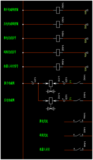 前三個(gè)為氣缸磁性開關(guān)檢測(cè)信號(hào),后兩個(gè)為配套PLC傳送給機(jī)器人大包和托盤準(zhǔn)備好的信號(hào),為了實(shí)現(xiàn)電氣隔離,需要將PLC給機(jī)器人的電平信號(hào)轉(zhuǎn)化為機(jī)器人自身的電平,需要通過(guò)繼電器來(lái)實(shí)現(xiàn)。