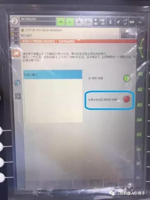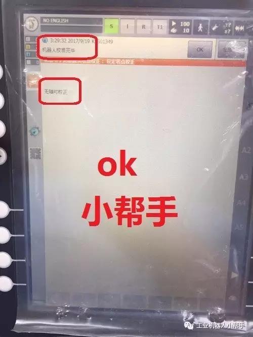 step 1:T1模式,無選擇程序,程序啟動(dòng)鍵正常,機(jī)器人各軸到達(dá)零點(diǎn)附近位置;